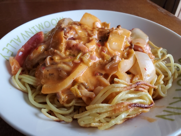 キムチ100gと生クリーム65㏄を加えて軽く炒めトロミがついたらソースは完成。