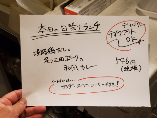 『淡路鶏だしと炙り三田ポークの和風カレー』で546円です。(数量限定)